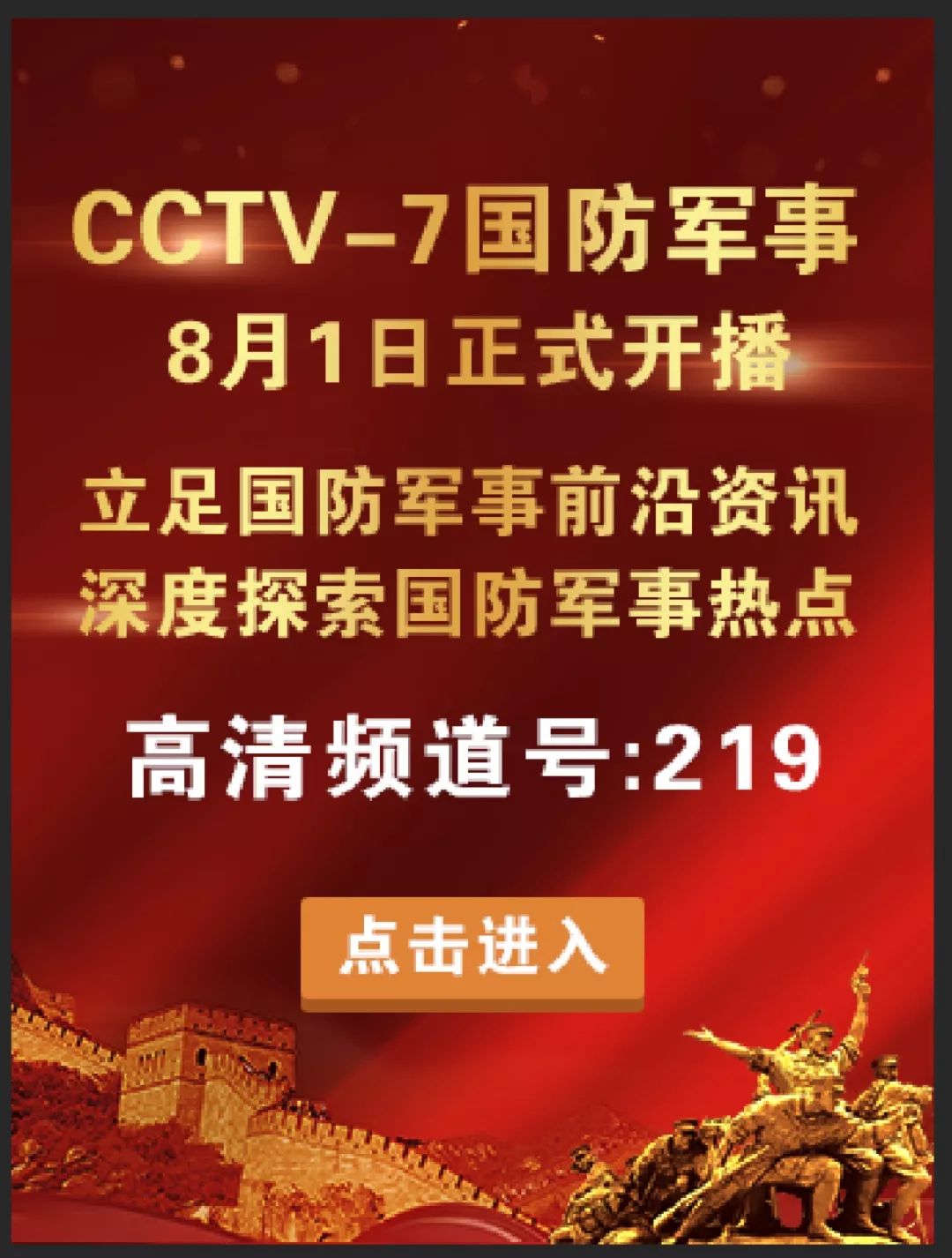 國防軍事頻道是國內(nèi)領(lǐng)先的軍事類節(jié)目播出平臺,為廣大軍事愛好者提供豐富、全面的軍事節(jié)目,頻道涵蓋了戰(zhàn)爭歷史、現(xiàn)代軍事動態(tài)、軍事科技、軍事人物等多個領(lǐng)域,深受觀眾喜愛。
